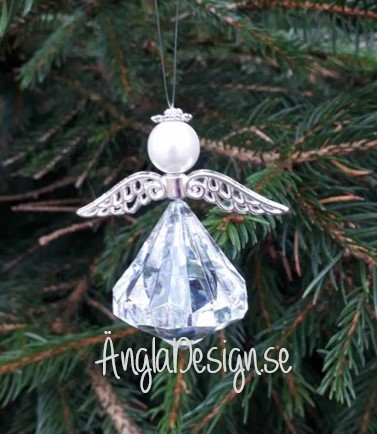 Hon har använt till den lilla prisman , 32-35mm änglavingar , vaxade glaspärlor 10mm (huvud), daisy 9-12mm (glorian)+ en liten 4-5mm daisy för att stoppa knuten att gå igenom den stora daisyn, och fiskelina 0,3mm. Sluta med att limma dom 2 knutarna med ett snabbtorkande lim som är genomskinligt. Lycka till :)